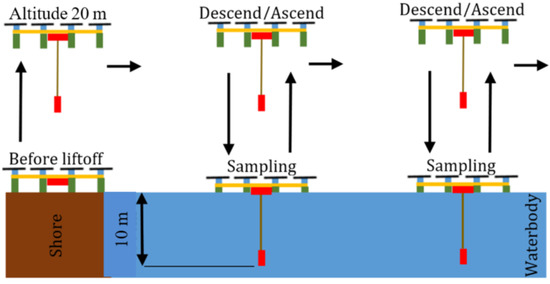 這項研究的目的是開發(fā)和測試用于湖泊溫度曲線和監(jiān)測的水溫測量系統(tǒng)無人機。Koparan等人報道了現(xiàn)場水質測量無人機。[ 19 ]通過用深度和溫度傳感器替換傳感器節(jié)點進行了重新建模,并對無人機上的浮力裝置進行了修改,以實現(xiàn)更安全的著陸。這里介紹的系統(tǒng)的新穎性在于,當溫度和壓力探頭下降時,無人機開始測量溫度和深度。該系統(tǒng)的另一個關鍵特征是,無人機可以降落在水面上并從水面上起飛,而不必在測量過程中懸停。