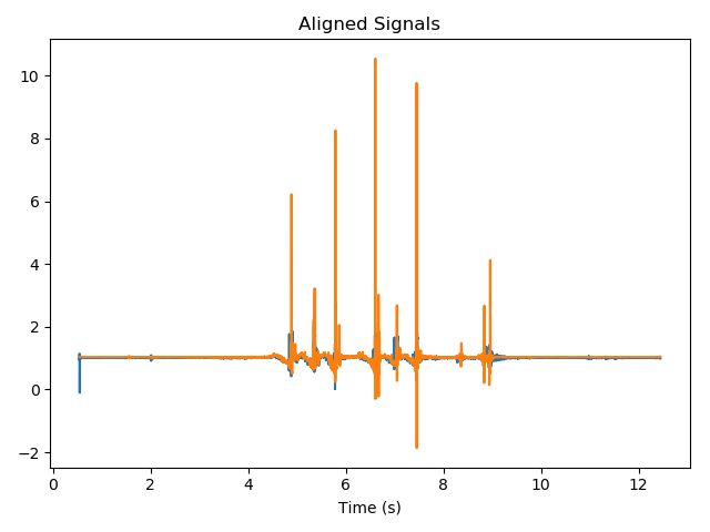 然后根據(jù)最佳的興趣點(diǎn)對(duì)(兩個(gè)信號(hào)中的每個(gè)信號(hào)之一)對(duì)信號(hào)進(jìn)行對(duì)齊。在我們的案例中,我們選擇“最佳”表示產(chǎn)生最大歸一化互相關(guān)的信號(hào)。