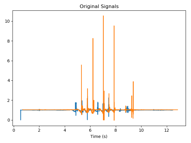 現(xiàn)在我們有兩個(gè)具有相同采樣率的信號(hào),我們必須確定兩次記錄開(kāi)始之間的時(shí)間偏移。這個(gè)問(wèn)題可以被定義為尋找最佳信號(hào)一個(gè)偏移噸 ∈( - LEN(信號(hào) 1),LEN(信號(hào) 2))? ?由一些度量,其最好的同步重采樣信號(hào)。我們還允許用戶(hù)指定兩個(gè)信號(hào)之間的最大起始時(shí)間偏移,以防止由一個(gè)信號(hào)中的最后幾個(gè)采樣與另一個(gè)信號(hào)中的前幾個(gè)采樣很好地同步引起誤報(bào)的可能性。