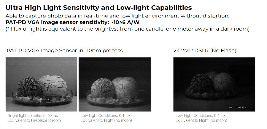 一個(gè)例子是SeeDevice的技術(shù),稱為PAT-PD(光子輔助隧穿照片檢測(cè)器),該技術(shù)實(shí)際上是消除了傳感器所說的“光子泄漏”,該公司稱這種技術(shù)將可見光和近紅外照片功能結(jié)合在一起。聲稱的好處包括在減少運(yùn)動(dòng)失真,低光捕獲和動(dòng)態(tài)范圍等領(lǐng)域超越了當(dāng)今的傳感器。該公司已經(jīng)在其網(wǎng)站上發(fā)布了幾張比較圖像,其中包括一張?jiān)跇O低光靜止圖像下勝過DSLR的圖像。