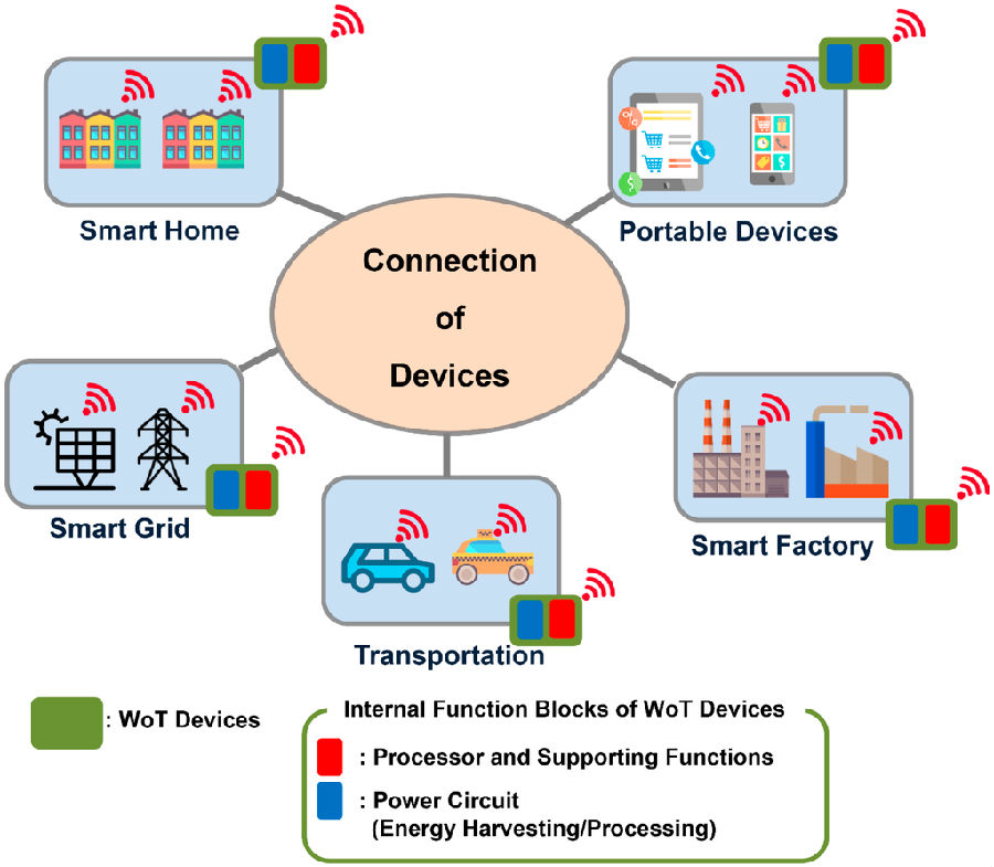 采用先進(jìn)的功率處理電路的技術(shù)已用于許多應(yīng)用的持續(xù)增長(zhǎng),例如無(wú)線傳感器網(wǎng)絡(luò),的IoT裝置,和家用電器。為了實(shí)現(xiàn)真正的物聯(lián)網(wǎng)(WoT)環(huán)境,需要用于各種連接設(shè)備的可靠電源電路。如圖1所示,此類設(shè)備內(nèi)部的電源電路執(zhí)行能量收集和功率處理,以使這些設(shè)備可操作并連接至WoT。此類WoT設(shè)備的處理器和發(fā)射器可以利用電源電路收集和處理的能量成功運(yùn)行。由于電源電路和不同類型的電源都在WOT裝置,它們的設(shè)計(jì)工程師不應(yīng)忽視的功率電路(例如,能量采集接口)對(duì)系統(tǒng)性能的因素的影響,如可靠性,成本和效率。本文考慮的用于WoT應(yīng)用的電源示例包括電池和太陽(yáng)能電池。為了使不同電源有效且高效地運(yùn)行,系統(tǒng)設(shè)計(jì)人員應(yīng)考慮WoT設(shè)備中使用的電源電路的可靠電路控制策略和電源管理算法。