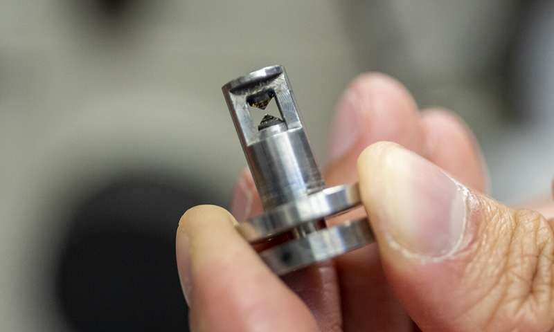 鉆石砧室。通過在這兩個相對的砧座之間壓縮樣品,可以獲得大于地球中心的壓力。圖片來源:Marilyn Sargent /伯克利實驗室