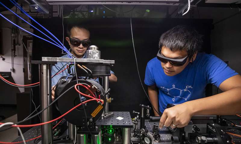 合著者Satcher Hsieh(左)和Chong Zu調(diào)整了成像系統(tǒng)的激光。當(dāng)被激光激發(fā)時,NV中心會發(fā)出光子,其光度會通知研究人員他們所感測的當(dāng)?shù)丨h(huán)境。圖片來源:Marilyn Sargent /伯克利實驗室