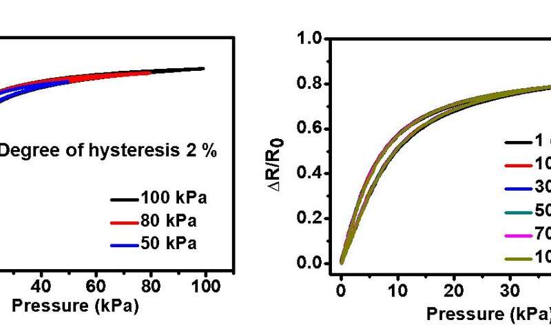 圖2.在不同壓力水平(左)和經(jīng)過不同循環(huán)次數(shù)(右)后,傳感器的磁滯回線。圖片來源:韓國科學技術高等研究院(KAIST)