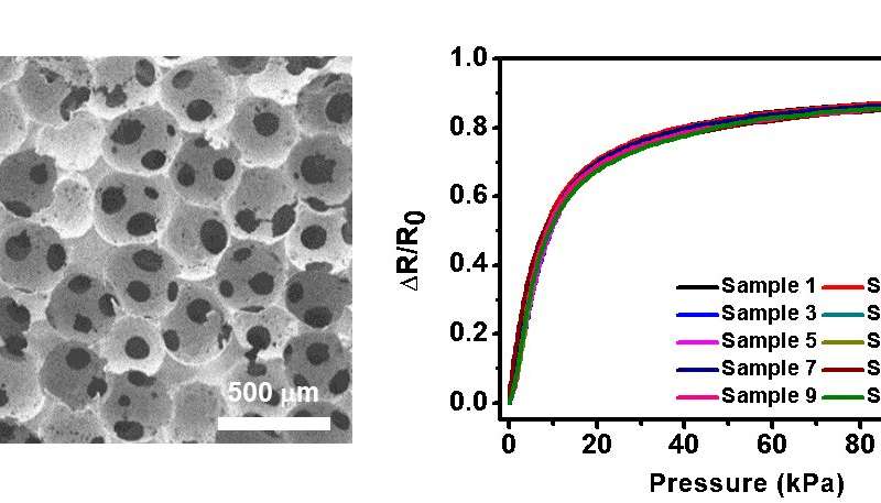 圖1.具有均勻孔徑和形狀的多孔彈性體模板的圖像(左),該圖顯示了傳感器性能的高度均勻性(右)。圖片來源:韓國科學技術高等研究院(KAIST)