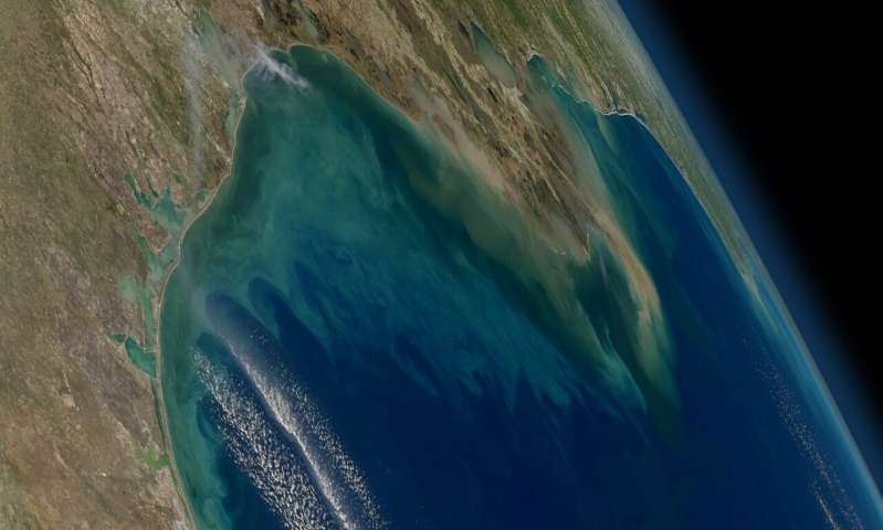 NASA的地球同步沿海成像和監(jiān)測輻射儀(GLIMR)儀器將收集墨西哥北部海灣地區(qū)沿海生態(tài)系統(tǒng)的高分辨率觀測結(jié)果,如這張圖片所示,其浮游植物水華從路易斯安那州海岸(左)橫跨密西西比河三角洲延伸(中)朝佛羅里達(dá)(最右邊)。圖片來源:NASA