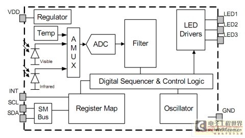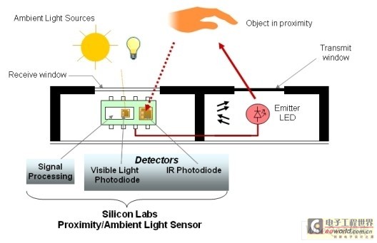 Si1143 紅外接近傳感器包括三個(gè)紅外LED驅(qū)動(dòng)器,紅外線光電二極管,一個(gè)環(huán)境光傳感器和控制邏輯IC組成,外部的發(fā)射LED可以根據(jù)用戶的需要靈活安裝和配置。如圖1所示。