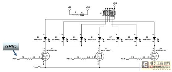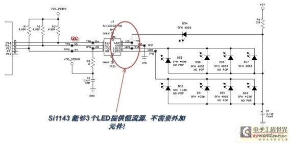 與Si1120不同的是,Si1143帶了三個(gè)LED驅(qū)動(dòng),當(dāng)連接多個(gè)紅外LED時(shí),如果只有單個(gè)LED驅(qū)動(dòng)(如圖6所示),則需通過MCU來控制MOS管分時(shí)驅(qū)動(dòng)LED,而Si1143(如圖7所示)本身就已具備3個(gè)LED驅(qū)動(dòng),所以可以直接連接到不同的LED 引腳,勿需再另加外圍器件,為硬件設(shè)計(jì)節(jié)省了成本。另外,Si1143采用?SMBus接口,可兼容I2C通訊,通用性更強(qiáng),同時(shí)也方便軟件的設(shè)計(jì)。