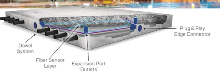 嵌入預(yù)制混凝土路面的光纖傳感器層利用蝕刻的光纖和入射光的失真來(lái)解釋有關(guān)其上方道路上發(fā)生的情況的數(shù)據(jù)。