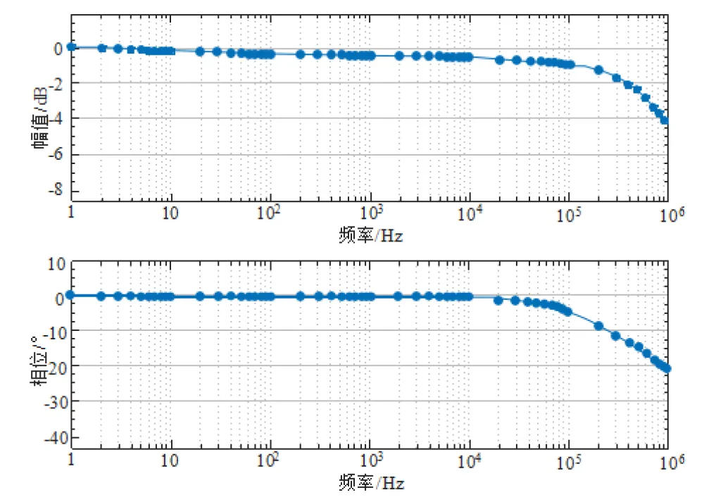 使用恒溫箱將TMR電流傳感器的工作環(huán)境設(shè)置為25℃室溫,斷開亥姆赫茲線圈的供電電流源,保持測(cè)試環(huán)境的純凈。因?yàn)殡娏髟纯梢援a(chǎn)生電流的頻率有限,采用信號(hào)發(fā)生器配合功率放大器ATA-4012對(duì)閉環(huán)式TMR電流傳感器進(jìn)行頻率響應(yīng)測(cè)試。將TMR電流傳感器的輸出接入雙通道示波器的A通道,同時(shí)將輸入信號(hào)一并接入示波器另一通道B。保持待測(cè)電流的幅值不變,改變其電流頻率,觀察閉環(huán)TMR電流傳感器的輸入和輸出信號(hào)之間的相位差,測(cè)量TMR電流傳感器時(shí)將電流設(shè)定為0.2A,得到下圖所示的不同頻率下閉環(huán)TMR電流傳感器的頻率響應(yīng)特性。