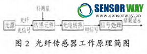 光纖傳感系統(tǒng)由光源、光導(dǎo)纖維、光傳感元件,光調(diào)制元件和信號(hào)處理五部分組成,其工作原理如圖2所示。光源發(fā)出的光經(jīng)過(guò)光導(dǎo)纖維進(jìn)入光 傳感元件,而在光傳感元件中受到周?chē)h(huán)境場(chǎng)的彩 響而發(fā)生變化的光再進(jìn)入光調(diào)制機(jī)構(gòu),由其將傳感 元件測(cè)量的參數(shù)調(diào)制成幅度、相位、偏振等信息, 最后利用微處理器進(jìn)行信號(hào)分析。