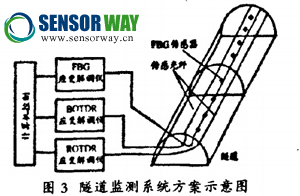 光纖傳感器在隧道上應(yīng)用比較成熟,例如武漢 的天興洲大橋上有成百上千個(gè)光纖傳感測(cè)點(diǎn),時(shí)時(shí) 監(jiān)控橋梁的結(jié)構(gòu)、受力和振動(dòng)等情況,一旦發(fā)現(xiàn)異 常,管理機(jī)構(gòu)就能立即采取措施。以某湖底隧道為 例,施工地質(zhì)條件不理想,難度大,尤其是湖區(qū)沙 層分布廣泛,厚度大,對(duì)隧道結(jié)構(gòu)采用了分布式 BOTDR光纖檢測(cè)系統(tǒng),沿隧道軸向敷設(shè)4根光纖, 其中兩根全面接著(監(jiān)測(cè)隧道整體變形),兩根定 點(diǎn)接著(監(jiān)測(cè)變形縫和潛在變形處的變形情況)。 通過(guò)采用光纖傳感器對(duì)隧道進(jìn)行監(jiān)測(cè),實(shí)時(shí)監(jiān)測(cè)隧 道變形情況,能夠獲得可靠的數(shù)據(jù),可分析出正確 結(jié)果,反映隧道實(shí)際受力情況,起到隧道的健康監(jiān) 測(cè)、預(yù)防保護(hù)作用;能夠體現(xiàn)出光纖光柵傳感器的強(qiáng)大優(yōu)勢(shì),保證了施工的順利進(jìn)行,提升了施工質(zhì)量。光纖傳感器在橋梁隧道監(jiān)測(cè)方面的應(yīng)用主要有 以下三個(gè)方面:對(duì)采用新型復(fù)合材料的橋梁結(jié)構(gòu)進(jìn) 行監(jiān)測(cè),掌握材料和結(jié)構(gòu)的工作性能;對(duì)交通樞紐或具有重大意義的大型橋梁進(jìn)行健康監(jiān)測(cè),掌握橋 梁的正常運(yùn)行狀態(tài);對(duì)有一定損傷的舊橋進(jìn)行監(jiān) 測(cè),從而了解其健康狀況并采取針對(duì)性的維護(hù)和加固措施。如圖3所示: