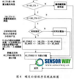 式(1)是加載到S1點天平的稱重值;式(2)是加載穩(wěn)定到S1點和進行蠕變補償后天平的稱重值,式中載荷蠕變和受加載影響天平零點蠕變值同是ε。?蠕變跟蹤補償?shù)年P鍵是判斷和確定圖1所示的S1點、蠕變量ε與時間的關系,然后根據(jù)這一關系進行蠕變補償。補償思路見圖4.圖4的前半段是確定S1點,后半段是蠕變跟蹤處理。這里的關鍵問題是如何確定蠕變跟蹤量和跟蹤時間的關系。圖1只定性地說明傳感器的蠕變特性,但是,每個傳感器都有定量的特性,也就是蠕變量ε與時間的關系。只有確定這一關系,才能確定蠕變跟蹤時間和跟蹤量(圖4中的AD_STA3)。解決的辦法是在天平標定時一起確定蠕變曲線。具體做法是:加載砝碼標定時按規(guī)程測試蠕變特性,單片機先記錄下S1點,并記錄每隔固定的時間段的當前A/D值與S1點的差值,這就是該段時間的蠕變值。用軟件辦法記錄下這個傳感器蠕變量與時間的關系,然后再根據(jù)這一關系確定跟蹤量(AD_STA-3)和跟蹤時間。確定的原則是:固定的時間段蠕變量越大,跟蹤量(AD_STA-3)就越大和跟蹤間隔時間就越小。反之,跟蹤量(AD_STA-3)就越小和跟蹤間隔時間就越大。