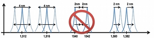 圖4.同一條光纖上掛接的每一個(gè)FBG傳感器必須具有其獨(dú)立的工作波長(zhǎng)范圍
