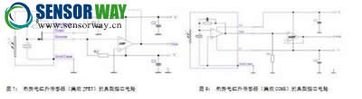 熱勢電是紅外傳感器中重要的一種,其傳感器及其典型接口電路如圖7和圖8所示,框中部分是傳感器,內(nèi)部集成有JFET和CMOS運放兩種形式。對外部均需要精密運算放大器對輸出的信號進行調(diào)理。溫度的變化對于此類傳感器影響較大,一般有溫度校正的環(huán)節(jié)。