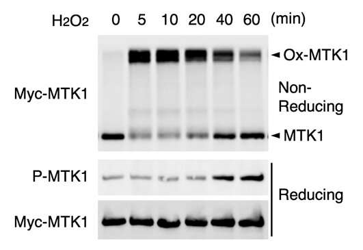 氧化應(yīng)激誘導(dǎo)的MTK1活化需要MTK1的氧化和還原。將細胞用H2O2處理指定的時間。細胞提取物在非還原條件下進行電泳,并用抗Myc抗體進行免疫印跡(上圖)。免疫沉淀的Myc-MTK1在還原條件下進行電泳,并用抗P-MTK1或抗Myc抗體(中間和底部)進行探測。圖片來源:東京大學(xué)醫(yī)學(xué)科學(xué)研究所