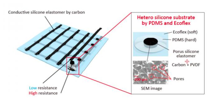 有機(jī)硅基材由兩種不同類型的有機(jī)硅制成-一種硬而一種軟。較硬的有機(jī)硅(PDMS)可以抑制壓力感應(yīng)元件在應(yīng)變下的變形。圖片由橫濱國(guó)立大學(xué)大田裕樹(shù)提供