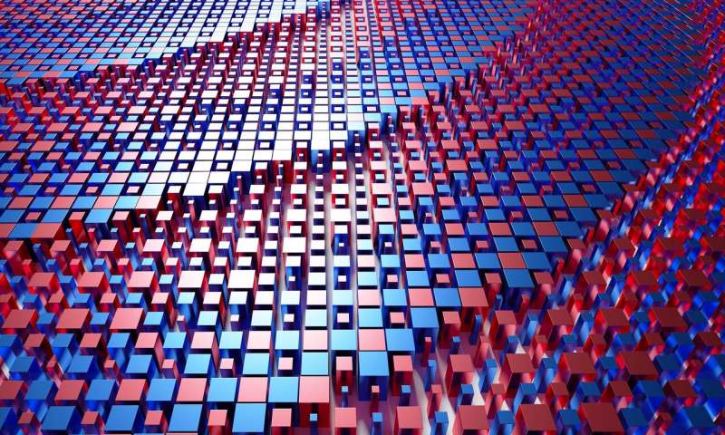 為緊湊的深度感應(yīng)設(shè)計(jì)的金屬元件的插圖。它由亞波長(zhǎng)間隔的方形納米柱組成。通過交替顯示兩種不同的納米柱圖案(在此以紅色和藍(lán)色顯示),該金屬元素同時(shí)形成了兩個(gè)圖像。這兩個(gè)圖像模仿了跳躍蜘蛛眼中分層視網(wǎng)膜捕獲的圖像。圖片來源:郭琦和石柱君/哈佛大學(xué)