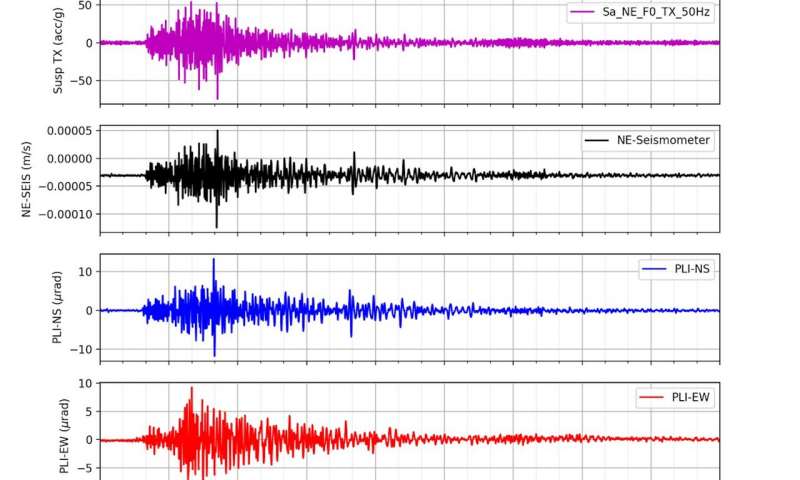 對(duì)于8月17日意大利北部發(fā)生的地震,PLI(下兩個(gè)圖)采集的信號(hào)與處女座上已安裝的設(shè)備(上兩個(gè)圖)相同。圖片來(lái)源:Beniamino Di Girolamo / CERN