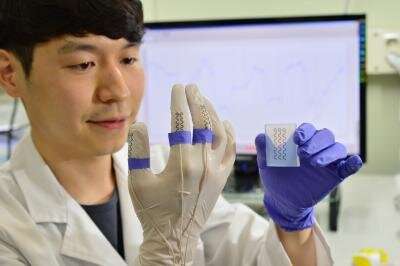 借助KIST后硅半導體研究人員開發(fā)的轉(zhuǎn)移印刷技術(shù),他們正在進行實驗,通過在實驗手套的頂部安裝高性能傳感器來檢測手指的運動。圖片來源:韓國科學技術(shù)學院(KIST)