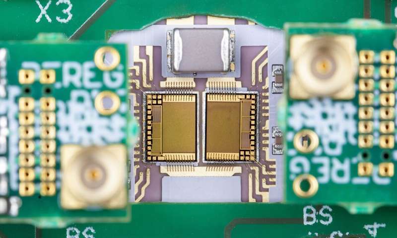 具有集成晶體管,柵極驅(qū)動器,二極管以及用于狀態(tài)監(jiān)控的電流和溫度傳感器的GaN功率IC。圖片來源:Fraunhofer IAF