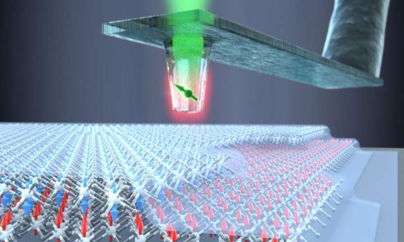 金剛石量子傳感器用于以定量方式確定材料三碘化鉻的各個(gè)原子層的磁性能。結(jié)果表明,連續(xù)層中自旋的方向在各層中交替。圖片來源:巴塞爾大學(xué)物理系