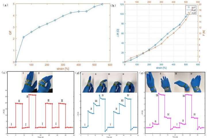 研究人員使用該傳感器進(jìn)行關(guān)節(jié),手指和腕部運(yùn)動(dòng)的精確檢測,從而獲得了出色的性能。他們的結(jié)果表明該傳感器在柔性可穿戴電子設(shè)備中的巨大應(yīng)用潛力。