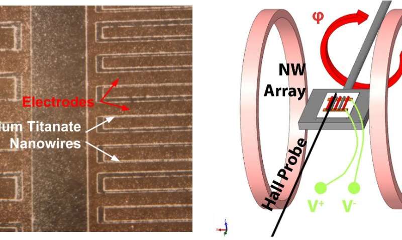 左:鈦酸鋇納米纖維在水中的成功組裝,用稀HCl洗滌除去碳酸鋇后,用檸檬酸懸浮,并在5 kHz和20 Vpp下將pH調(diào)節(jié)至9。右:旋轉(zhuǎn)磁電測(cè)量設(shè)置的示意圖,其中可以調(diào)整陣列相對(duì)于所施加磁場(chǎng)的角度,以探索感應(yīng)對(duì)測(cè)得的磁電系數(shù)的影響。圖片來源:佛羅里達(dá)大學(xué)