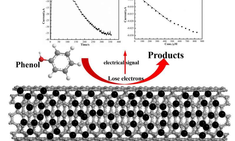 用于苯酚檢測的基于Ni / MWCNT的電化學(xué)傳感器的示意圖。化學(xué)鍍方法將鎳納米顆粒均勻分散在MWCNT表面,為苯酚的吸附和電氧化提供了更容易接近的活性位;此外,MWCNT的優(yōu)異電導(dǎo)率可提高電極界面上的電子傳輸速率,從而增強(qiáng)響應(yīng)靈敏度。這些因素使其具有較高的靈敏度,快速的響應(yīng)性,因此有潛力用于排放廢水中的苯酚檢測。信用:作者