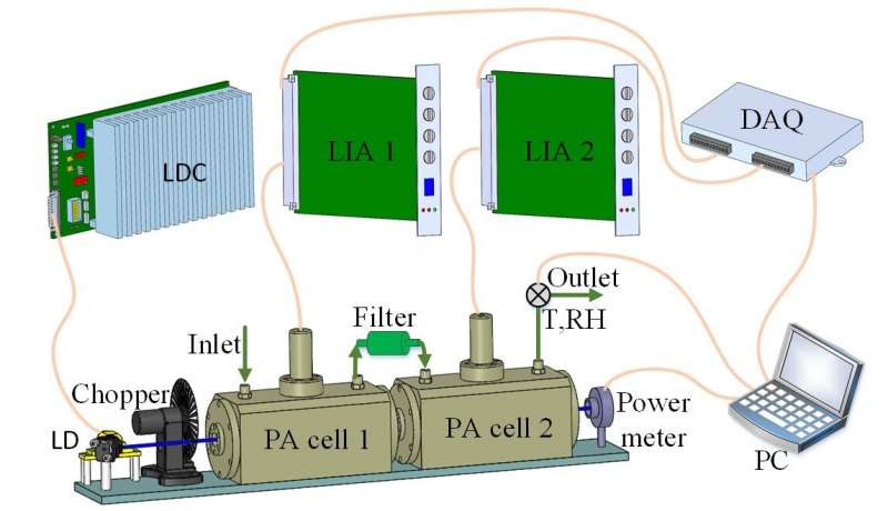 研究小組成員劉Kun教授解釋說(shuō):“該P(yáng)AS(D-PAS)基于443 nm激光二極管! “通過(guò)優(yōu)化聲諧振器的結(jié)構(gòu),我們實(shí)現(xiàn)了在線測(cè)量氣溶膠吸收和NO 2的高靈敏度和大流量!