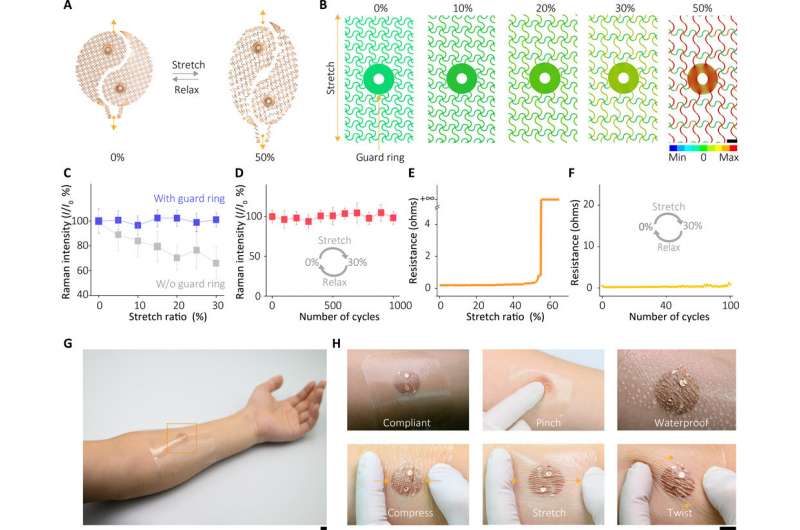 設(shè)備的機(jī)械特性。(A)傳感器變形時(shí)的光學(xué)圖像。(B)在各種變形下對(duì)可拉伸電極的保護(hù)環(huán)區(qū)域的FEM應(yīng)變分布分析,表明該保護(hù)環(huán)可以將較大的變形隔離到軟彈性體中,從而避免了對(duì)SERS傳感組件產(chǎn)生潛在的破壞性塑性應(yīng)變。(C)傳感器在各種變形下的SERS響應(yīng)。(D)循環(huán)拉伸試驗(yàn)后SERS傳感器的特性。(E)電極在各種變形下的電阻變化。(F)循環(huán)拉伸試驗(yàn)后電極中的電阻變化。(G)在人體皮膚上安裝的傳感器的照片,以及(H)在各種條件下的照片。圖片來源:浙江大學(xué)劉向江。比例尺為1毫米(B)和1厘米(G和H)。誤差線定義為±SD。圖片來源:Science Advances,doi:10.1126 / sciadv.abe4553