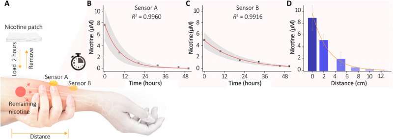 人體皮膚中尼古丁代謝過程的體內(nèi)監(jiān)測(cè)。(A)實(shí)驗(yàn)的示意圖。將包含?10 mg的尼古丁貼劑貼在志愿者的前臂上2小時(shí),然后將其取出。徹底清潔皮膚后,我們的傳感器會(huì)提取并分析皮膚中殘留的尼古丁。(B和C)從兩個(gè)位置(傳感器A直接位于修補(bǔ)區(qū)域;傳感器B連接約2厘米)測(cè)量了剩余尼古丁濃度的變化。在出汗20分鐘(0.5 mA離子電滲療法電流,10%乙酰膽堿氯化物負(fù)載的水凝膠)抽出20分鐘后進(jìn)行每次測(cè)量,并連續(xù)收集接下來10分鐘的傳感器響應(yīng)。圖中顯示了獲得的平均尼古丁水平。陰影區(qū)域表示測(cè)量值的±SD。(D)貼劑后抽出的汗液中尼古丁濃度的距離依賴性。六個(gè)傳感器沿著手臂放置在距修補(bǔ)區(qū)域0到12.5 cm的距離處。圖片來源:Science Advances,doi:10.1126 / sciadv.abe4553