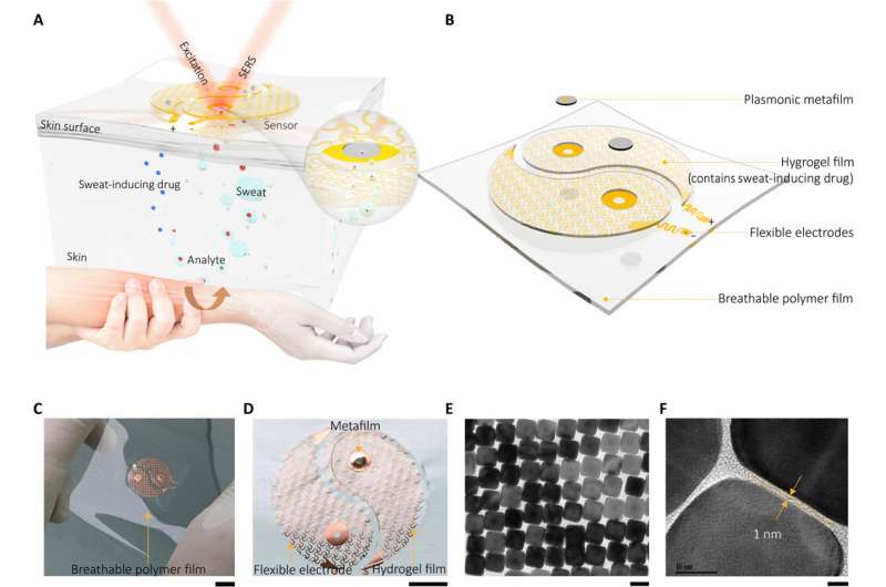 等離子體等離子材料集成的可穿戴SERS傳感設(shè)備。(A)顯示該設(shè)備工作原理和設(shè)計(jì)的示意圖;(B)由兩個(gè)主要組件(排汗組件和SERS感應(yīng)組件)組成,其樣式看起來像是陰陽(yáng)符號(hào)。插圖突出顯示了干膠片附近的按鍵感應(yīng)界面。(C)該設(shè)備的光學(xué)圖像,(D)出汗組件的放大光學(xué)圖像。在螺旋形的分形網(wǎng)狀電極上安裝了一層薄薄的水凝膠層,上面裝有刺激汗腺分泌的分子(乙酰膽堿氯化物)。請(qǐng)注意,為了突出顯示的對(duì)比度,只有一個(gè)電極安裝了水凝膠層和等離激元超膜。圖片來源:浙江大學(xué)王英利。(E和F)安裝在電極中央的SERS傳感組件的高分辨率透射電子顯微鏡(TEM)圖像,該組件是由有序的銀納米立方體(NC)超晶格形成的等離子超薄膜。1 cm(C),5 mm(D),50 nm(E)和5 nm(F)的比例尺。圖片來源:Science Advances,doi:10.1126 / sciadv.abe4553