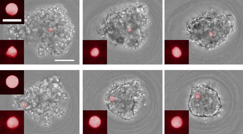 微小的熒光球(小紅點和小插圖)可用于在生物組織形成和生長時在細胞水平上測量力。球體在周圍細胞向其施加力時發(fā)生變形,該變形用于計算力。