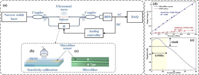 鑒于較大的倏逝場(chǎng),研究人員將超細(xì)纖維的直徑優(yōu)化為 7μm。如圖1b所示,通過(guò)使用具有高彈性光學(xué)系數(shù)的聚二甲基硅氧烷(PDMS)材料來(lái)封裝微纖維,進(jìn)一步提高了傳感器的靈敏度。當(dāng)超聲波作用在傳感器上時(shí),由于彈性光學(xué)效應(yīng),PDMS的折射率會(huì)發(fā)生相應(yīng)的變化,從而導(dǎo)致微纖維的有效折射率發(fā)生調(diào)制。構(gòu)建了一個(gè)馬赫-曾德?tīng)柛缮鎯x來(lái)解調(diào)由入射超聲波引起的詢問(wèn)激光的相位變化. 基于比例積分微分(PID)方法的反饋穩(wěn)定器用于補(bǔ)償由噪聲引起的低頻波動(dòng)。實(shí)驗(yàn)結(jié)果表明,與標(biāo)準(zhǔn)單模光纖傳感器相比,線性超細(xì)纖維超聲傳感器的靈敏度提高了一個(gè)數(shù)量級(jí)。該傳感器具有 153Pa 的低噪聲等效壓力和高達(dá) 14MHz (-10dB) 的寬響應(yīng)帶寬。此外,該傳感器可用于微弱信號(hào)的檢測(cè),通過(guò)優(yōu)化超細(xì)纖維和檢測(cè)系統(tǒng),提高傳感器的靈敏度和帶寬。