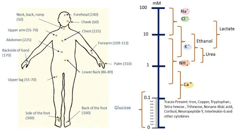 汗腺和化學痕跡的位置。圖片由Sensors(巴塞爾)提供