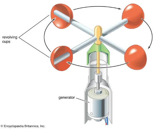 轉(zhuǎn)杯式電子風(fēng)速計示意圖。圖片由大英百科全書提供