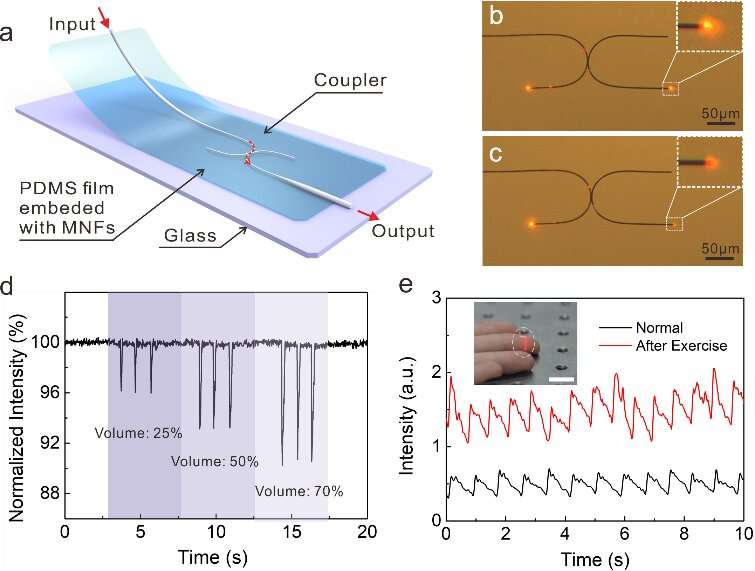 基于MNF耦合器的應(yīng)變傳感器工作原理 (a) 應(yīng)變傳感器結(jié)構(gòu)示意圖。(b), (c) MNF 耦合器在間隙略微變化之前和之后的光學(xué)顯微照片,分別。MNF的直徑約為900nm,彎曲半徑為50μm。(d) 設(shè)備對(duì)三種不同音量的節(jié)拍器的響應(yīng)。(e) 在正常情況下(每分鐘 72 次)和運(yùn)動(dòng)后(每分鐘 85 次)測(cè)量實(shí)時(shí)指尖脈搏波。插圖顯示了傳感器連接到指尖以測(cè)試指尖脈搏的照片,比例尺為 1 厘米。圖片來源:Compuscript Ltd