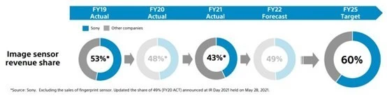 在今年 5 月舉行的索尼投資者關(guān)系日中的“圖像和傳感解決方案(I&SS)”部分,這位來(lái)自日本的圖像傳感器巨頭,除了公布了位于長(zhǎng)崎的 Fab5 進(jìn)一步擴(kuò)建計(jì)劃以及包含 JASM 在內(nèi)的投資項(xiàng)目等擴(kuò)產(chǎn)計(jì)劃以外,還強(qiáng)調(diào)了要在 2025 財(cái)年將索尼占整個(gè)圖像傳感器市場(chǎng)的營(yíng)收份額從 2021 財(cái)年的 43% 擴(kuò)大到 60%。