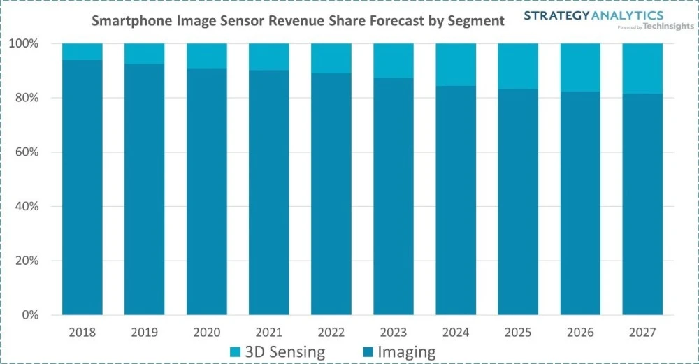 此外,圖像傳感器在非成像領(lǐng)域的應(yīng)用(例如汽車)也是一個(gè)機(jī)會(huì)。實(shí)際上,由于智能手機(jī)在圖像傳感器需求中的主導(dǎo)地位,對(duì)非成像領(lǐng)域圖像傳感器的強(qiáng)勁需求很可能被忽視了!拔艺J(rèn)為這一趨勢(shì)將繼續(xù)增長(zhǎng)。我對(duì)此很有信心,因?yàn)樵趫D像傳感器的許多應(yīng)用中,圖像本身并不是最終目標(biāo)”,知名圖像傳感器博客 Image Sensors World 的作者之一 Atul Ingle 在《集微訪談》節(jié)目中接受筆者采訪時(shí)表示。實(shí)際上,根據(jù) Strategy Analytics 的數(shù)據(jù),即便在手機(jī)領(lǐng)域,用于空間傳感的圖像傳感器營(yíng)收占比也呈現(xiàn)著逐年遞增的趨勢(shì)。