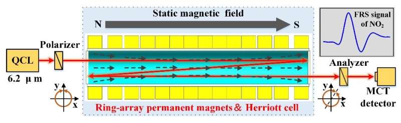 低功率法拉第旋轉(zhuǎn)光譜(FRS)二氧化氮(NO2)基于環(huán)形陣列永磁體的傳感器是由中國(guó)科學(xué)院合肥物理科學(xué)研究院高曉明教授領(lǐng)導(dǎo)的研究人員提出的,根據(jù)發(fā)表在《分析化學(xué)》上的一項(xiàng)研究。