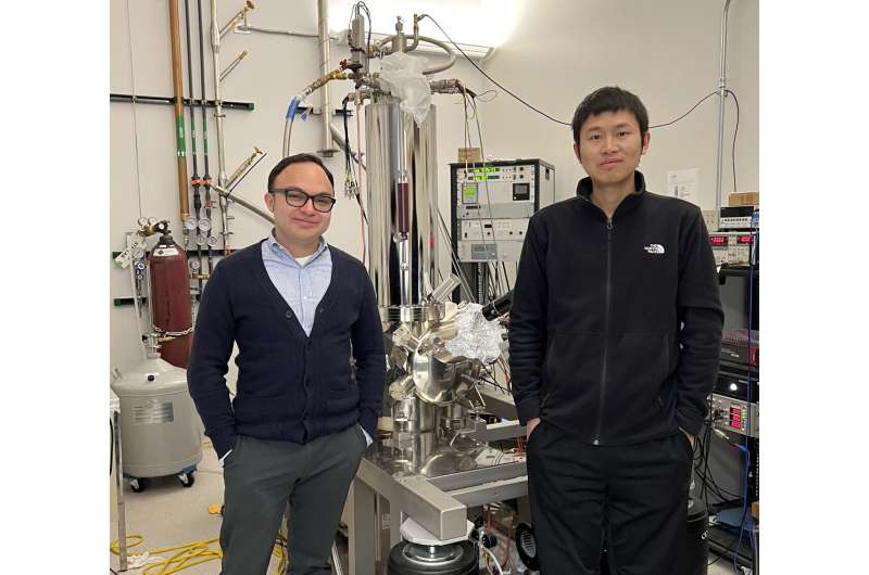 物理學家Jairo Velasco Jr.(左)和研究生Zhehao Ge在加州大學圣克魯斯分校的Velasco實驗室。在他們身后是他們用來創(chuàng)建和研究石墨烯量子點的掃描隧道顯微鏡(STM)。