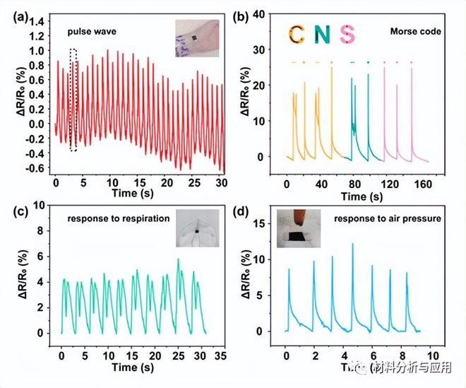 通過調(diào)整打印參數(shù),傳感層具有微點(diǎn)特征的GSCA 3D結(jié)構(gòu)可以提供低于60 ms的快速響應(yīng),并將靈敏度提高32.4%(26-78 kPa)、800%(78-102 kPa)和600%(102-160 kPa)。該傳感器具有11.4 Pa的低檢測(cè)限和較大的檢測(cè)范圍,線性靈敏度為1.4–509 kPa。兩個(gè)相鄰微點(diǎn)之間的蜘蛛腿狀微/納米纖維有助于電子傳輸和氣流傳感。結(jié)果表明,基于石墨烯的點(diǎn)傳感器在識(shí)別空氣強(qiáng)度以及呼吸和氣流方向方面的可行性。GSCA在實(shí)時(shí)個(gè)人監(jiān)控中的進(jìn)一步驗(yàn)證證明了多任務(wù)可穿戴傳感器的潛力。