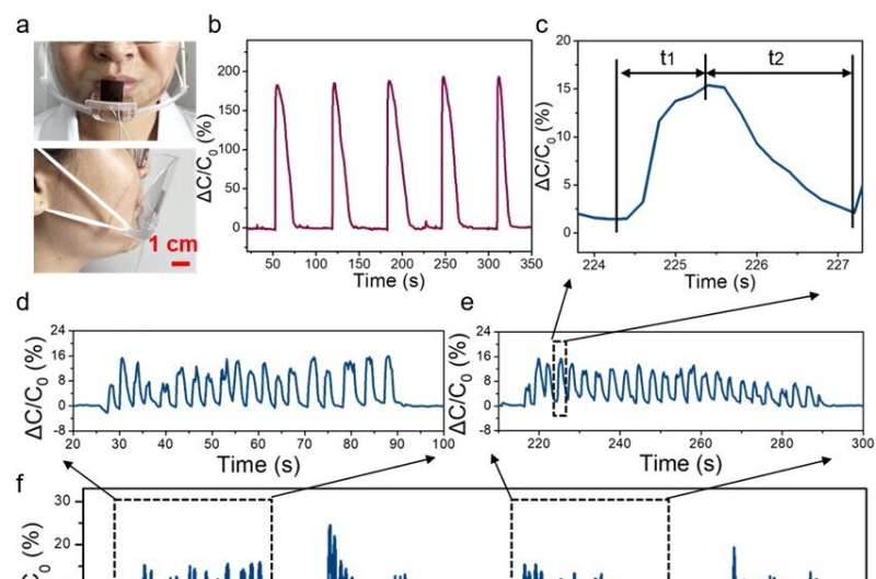 (a) 佩戴在對(duì)象臉上的商用口罩上的濕度傳感器的照片。(b) 在休息狀態(tài)下通過口腔對(duì)受試者進(jìn)行人體呼吸測(cè)試。(c) 傳感器的響應(yīng)和恢復(fù)時(shí)間。(d)-(f) 實(shí)時(shí)監(jiān)測(cè)處于靜止?fàn)顟B(tài)的受試者的鼻子呼吸頻率。實(shí)時(shí)監(jiān)測(cè)棕櫚水分,同時(shí)(g)飲用熱水和(h)運(yùn)動(dòng)。學(xué)分:光電進(jìn)展(2023 年)。DOI: 10.29026/oea.2023.220172