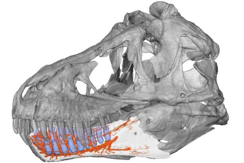 雖然已經(jīng)在幾種化石爬行動物中分析了頜骨血管和神經(jīng)的形態(tài),但這項研究是對霸王龍下頜骨內(nèi)部結構的研究。