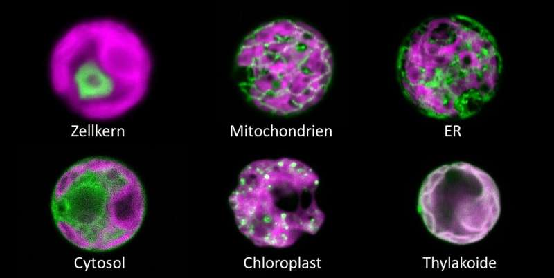 H 2 O 2 傳感器(綠色)位于由大葉綠體(品紅色)填充的衣藻細(xì)胞的 6 個(gè)隔室中。學(xué)分:AG Schroda