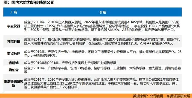 六維力矩傳感器壁壘較高,國產(chǎn)六維力矩傳感器與外資主流傳感器仍存在差距。從競爭格局看,美國的ATI產(chǎn)品類型多,性能良好,為Kuka、ABB、安川等協(xié)作機(jī)器人廠商提供核心產(chǎn)品;德國的HBM、ME,均可自產(chǎn)應(yīng)變片;瑞士Kistler是電壓式的佼佼者。國產(chǎn)廠商中,宇立儀器、坤維科技、鑫精誠、海伯森、藍(lán)點觸控、神源生智能、瑞爾特測控等已有相關(guān)的產(chǎn)品落地并進(jìn)入產(chǎn)業(yè)化應(yīng)用,新進(jìn)入者東華測試、昊志機(jī)電、埃力智能等已初步具備六維力矩傳感器的生產(chǎn)能力,部分產(chǎn)品已開始送樣測試。不過,曾朵紅等人表示,六維傳感器的壁壘更多在于工藝,無明顯卡脖子環(huán)節(jié),中國廠商在中低端產(chǎn)品上已突破,且產(chǎn)品性價比高,且更多資本進(jìn)入該領(lǐng)域加速技術(shù)迭代,中國廠商優(yōu)勢明顯。