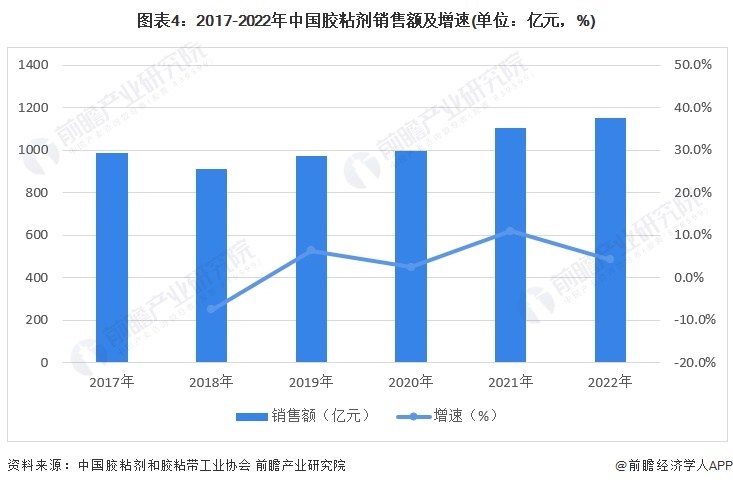 我國膠粘劑行業(yè)的生產(chǎn)規(guī)模迅速擴(kuò)大,產(chǎn)品產(chǎn)銷量保持高速增長。據(jù)中國膠粘劑和膠粘帶工業(yè)協(xié)會(huì)統(tǒng)計(jì),2022年我國膠粘劑行業(yè)總產(chǎn)量約788.4萬噸,銷售額約1151.4億元人民幣,分別比2021年增長3.30%和4.37%。隨著新能源行業(yè)的崛起,光伏、風(fēng)電、動(dòng)力電池對于粘膠劑的需求占比越來越高,同時(shí)行業(yè)需求增速也十分快速。