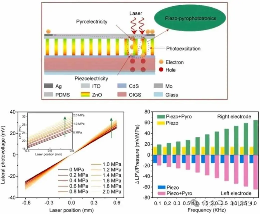 為了控制LPE性能,利用壓電光電效應將具有c軸取向的均勻氧化鋅納米線陣列集成到異質(zhì)結中。當對異質(zhì)結施加垂直壓力時,氧化鋅納米線中由壓力引起的壓電勢會改變能帶結構,增強光生電荷載流子的傳輸,提高輸出LPV。LPV的增強取決于激光位置、功率和波長,與0~2.0 MPa外部壓力呈現(xiàn)了極好的線性關系。這表明了其寬廣的線性響應范圍和穩(wěn)定的壓力靈敏度。此外,瞬態(tài)溫度變化誘導的熱釋電勢與脈沖激光照射下通過熱釋電光電子效應促進的載流子梯度相耦合,最終實現(xiàn)了64.25 mV/MPa的最佳壓力靈敏度和7.8/8.9 μs的驚人快速響應。這項研究提出了一種利用單片結構開發(fā)基于壓電-熱釋電光電子效應的超快、高靈敏度、自供電壓力傳感器的新方法。