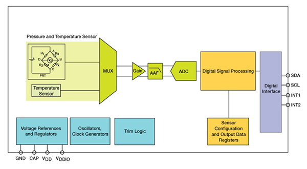 LGA 封裝帶孔,允許外部壓力到達傳感元件。該傳感器為壓阻式傳感器,包括檢測元件和一個通過 I2C 或 SPI 將檢測元件連接到應(yīng)用的 IC 接口。